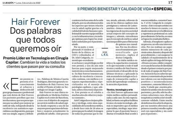 Por su parte, y completando el tándem al frente de la clínica, su CEO y co-fundador, el Dr. Ariel Cotignola, comentó que “es realmente un honor y un privilegio recibir este premio, y nos da aún más fuerzas para seguir mejorando tanto técnica como humanamente. En Hair Forever tenemos una cultura de excelencia e innovación continua, con médicos y cirujanos experimentados y especializados en el manejo de patologías capilares, y que, además, saben cómo tratar al paciente. Este premio es el colofón a muchos años de esfuerzo y mejora constante”.